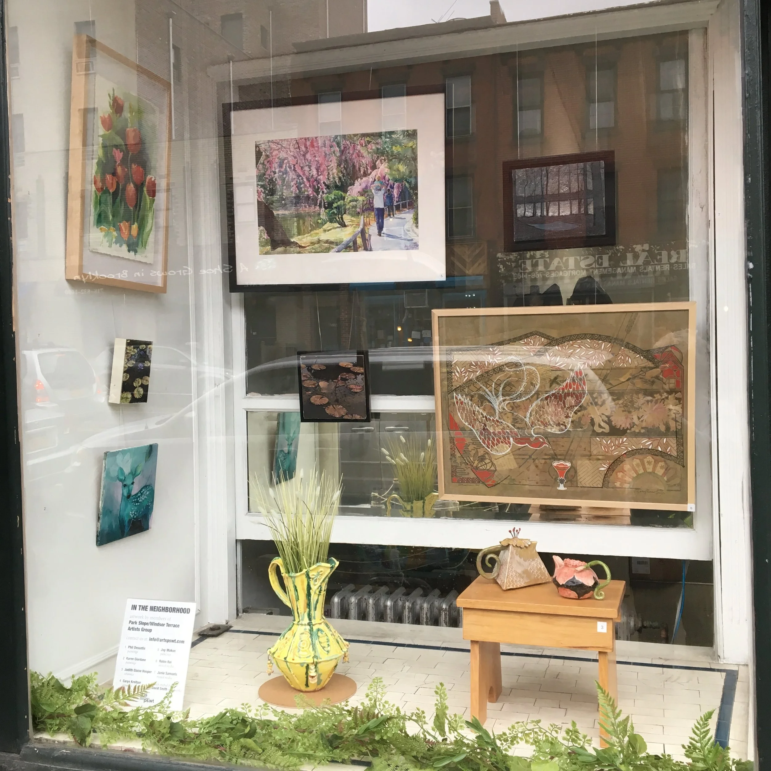 We love it when our artwork gives back to the neighborhood. That’s why we are so proud to be able to showcase our artwork in Assemblymember Robert Carroll’s storefront office on 7th Avenue near 14th Street in Park Slope. Even when installing the newest showcase—our sixth one—we see neighbors, school kids, and visitors stopping to peek in the window to see what we’re up to. Smile & wave... The Spring-themed window has artwork by: Phil Desantis, Karen Giordano, Judith Eloise Hooper, Caryn Kreitzer, Joy Makon, Robin Roi, Janie Samuels. Thank you to Assemblymember Robert Carroll and his staff for providing us this showcase to be a part of the PS-WT neighborhood.